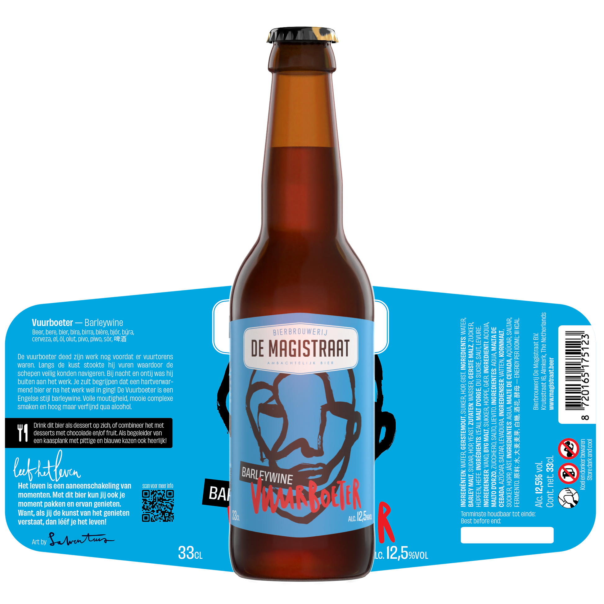De Vuurboeter is a solid English barley wine of 12.5%. A full body of the used malts and a nice bitterness to balance it. In the aftertaste beautiful full flavors and wonderfully warm from the alcohol. A beer to enjoy pure.