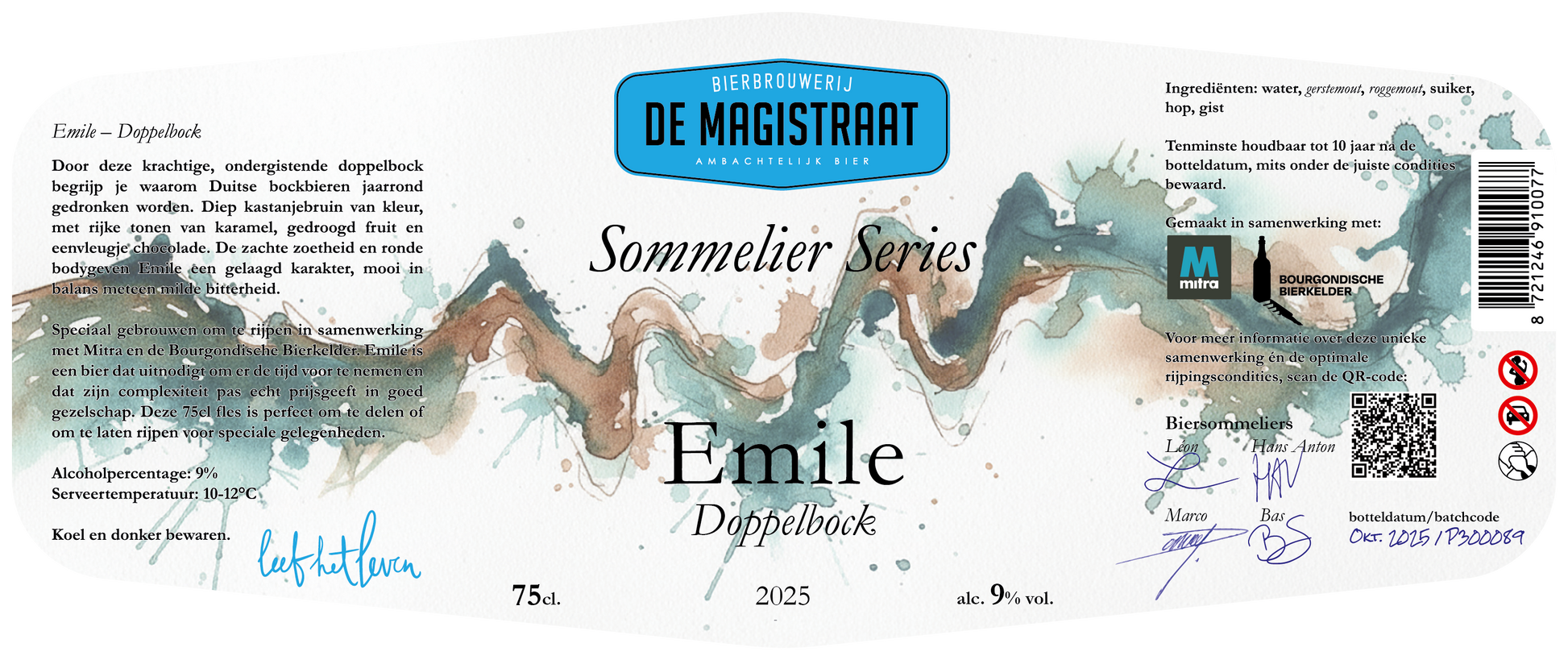 Speciaal gebrouwen om te rijpen in samenwerking met Mitra en de Bourgondische Bierkelder. Emile is een bier dat uitnodigt om er de tijd voor te nemen en dat zijn complexiteit pas echt prijsgeeft in goed gezelschap. Deze 75cl fles is perfect om te delen of om te laten rijpen voor speciale gelegenheden.