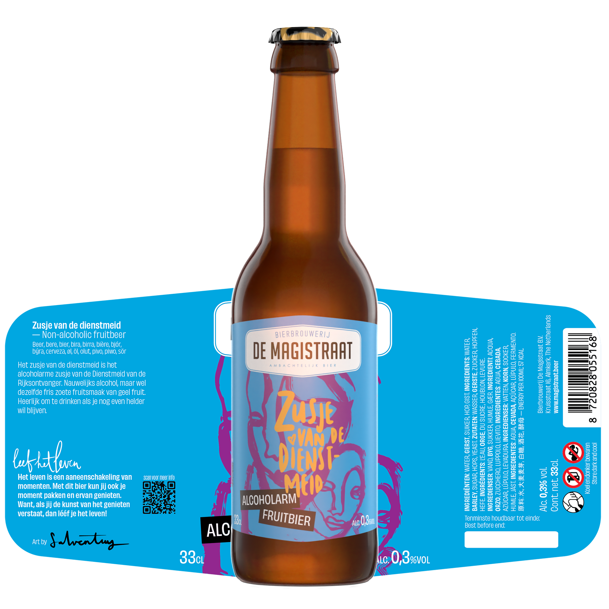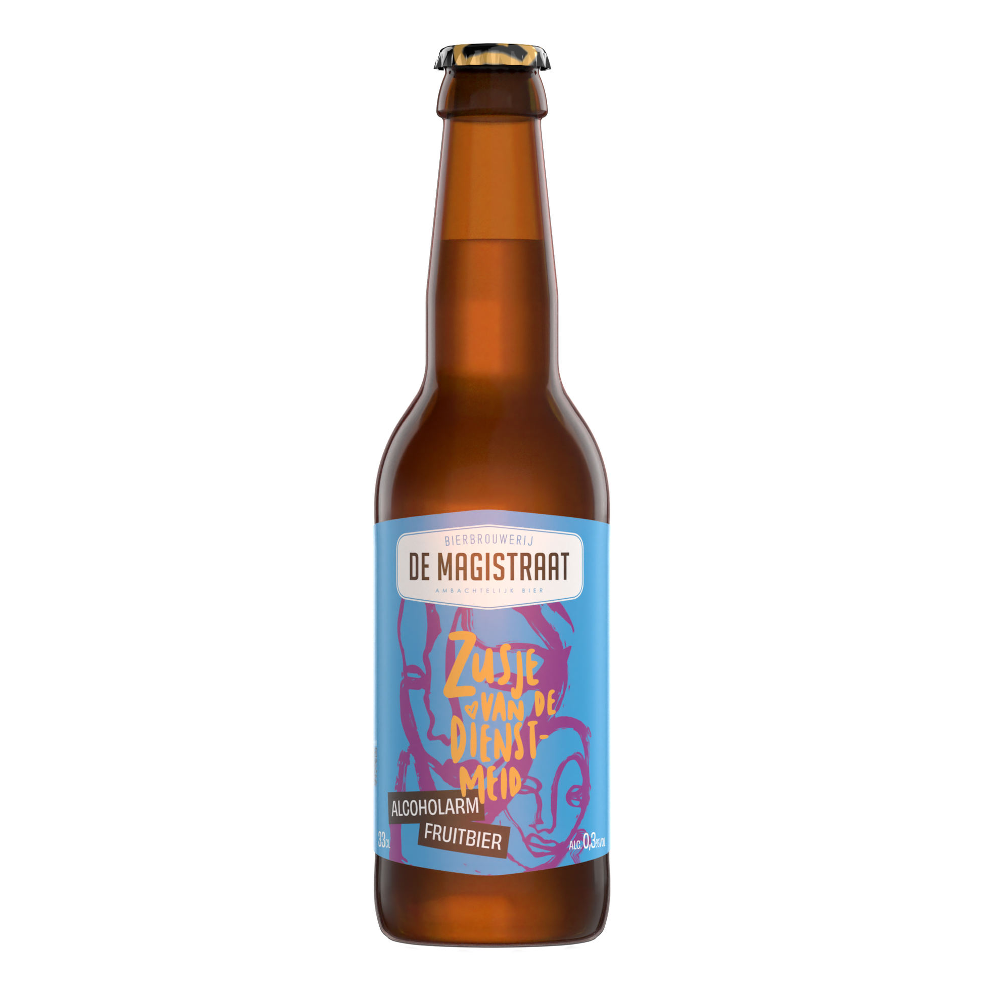Het Zusje van de Dienstmeid is onze alcoholarme versie van de Dienstmeid van de Rijksontvanger. Het is dus een fruitbier met geel fruit (ananas, mango, etc) en slechts 0,3% alcohol. Heerlijk fris, doordrinkbaar en je kunt gewoon met de auto naar huis!